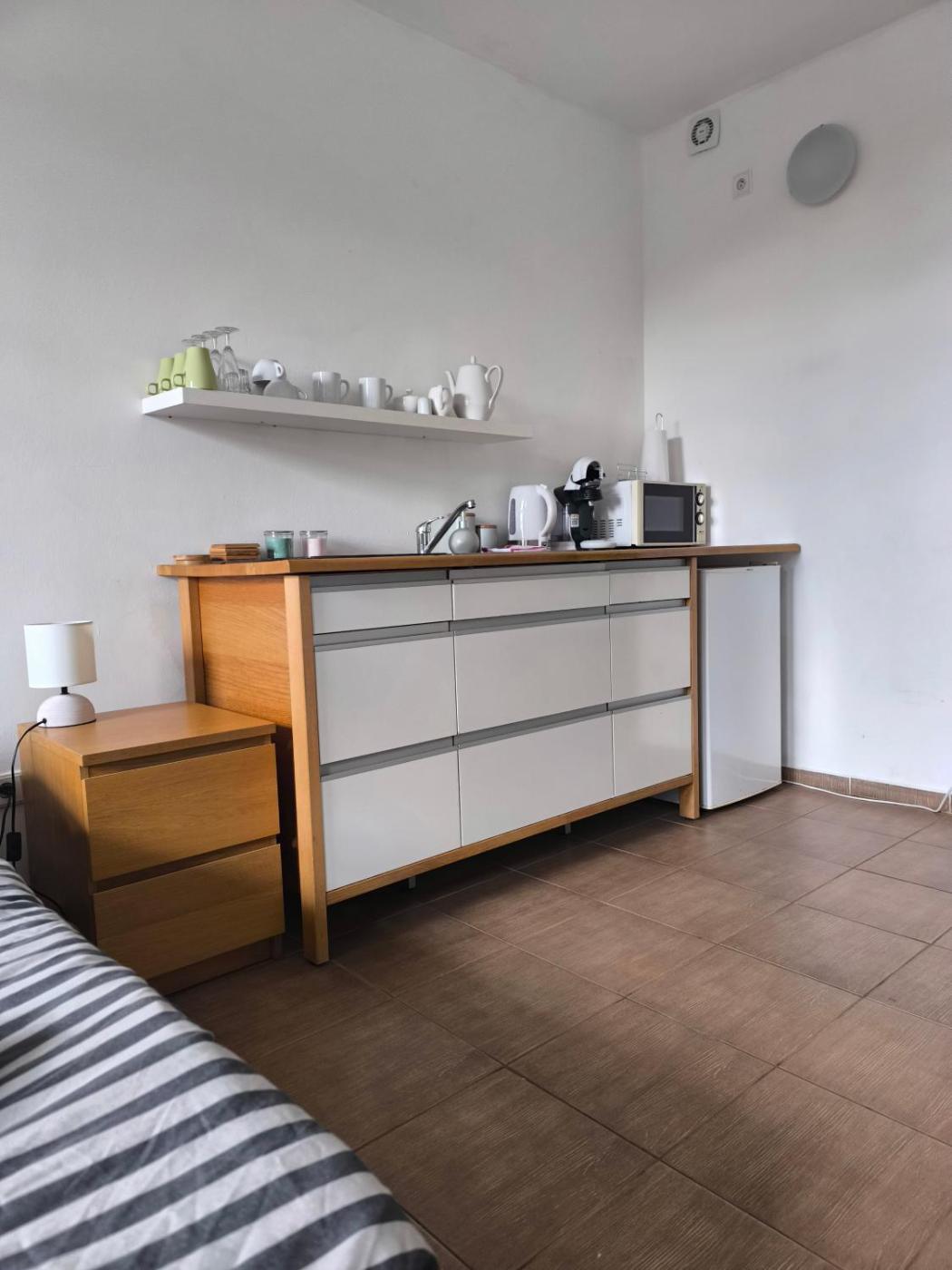 The apartment features a flat-screen TV. The kitchenette comes with a microwave, a fridge and kitchenware, as well as coffee machine and kettle.