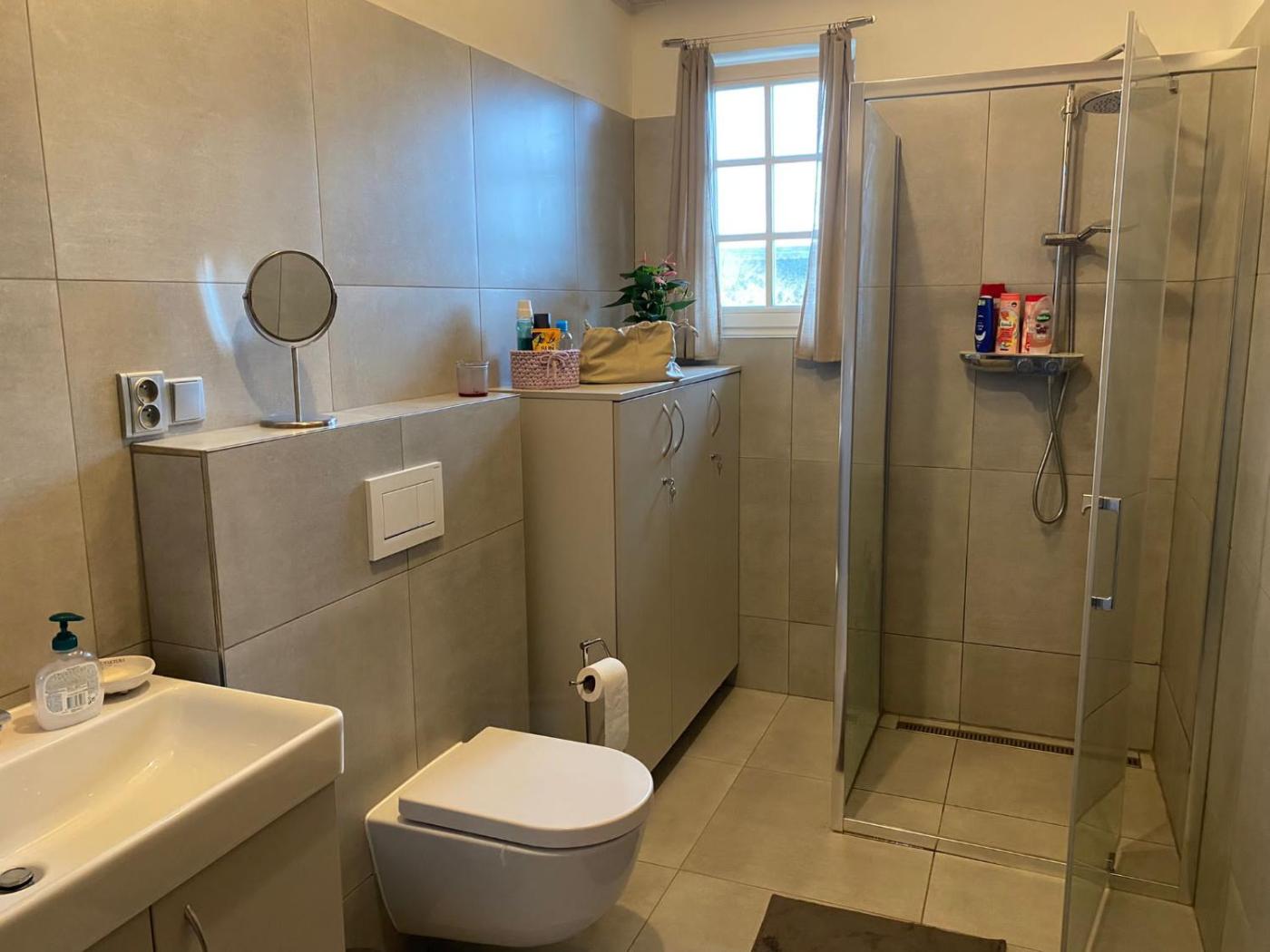 Three-Bedroom House. This spacious holiday home features 1 living room, 3 separate bedrooms and 3 bathrooms with a walk-in shower and free toiletries. Guests will find a stovetop, a refrigerator, a dishwasher and kitchenware in the fully equipped kitchen. The holiday home also comes with a barbecue. Boasting a terrace with garden views, this holiday home also features a washing machine and a flat-screen TV with streaming services. The unit has 8 beds.