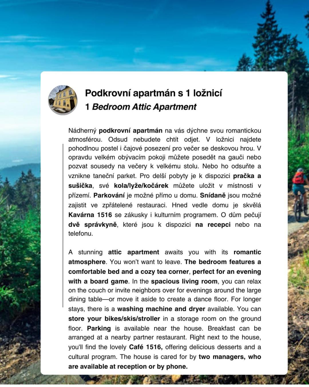 Apartmány za Královskou mincovnou features city views, free WiFi and free private parking, situated in Jáchymov, 10 km from Fichtelberg. Featuring a garden, the property is located within 23 km of Market Colonnade. The apartment has private entrance.